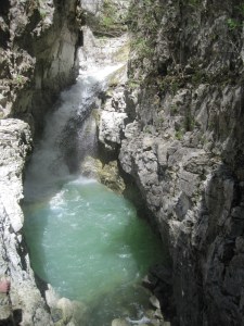 Hidden around a bend, a good-sized waterfall (not Niagara or Victoria but more than the water pouring out of my tap at home) gushed over a ledge and down into a pit.