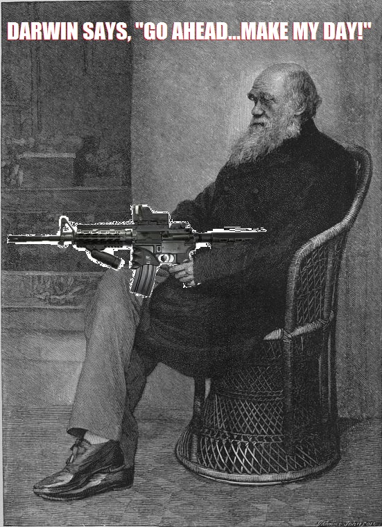 Their logo — Charles Darwin calmly seated in a rattan chair, holding an AR-15 rifle in his hands, the weapon propped on top of a knee crossed over one leg, the motto written in bold type above his head: DARWIN SAYS, ” GO AHEAD…MAKE MY DAY!”