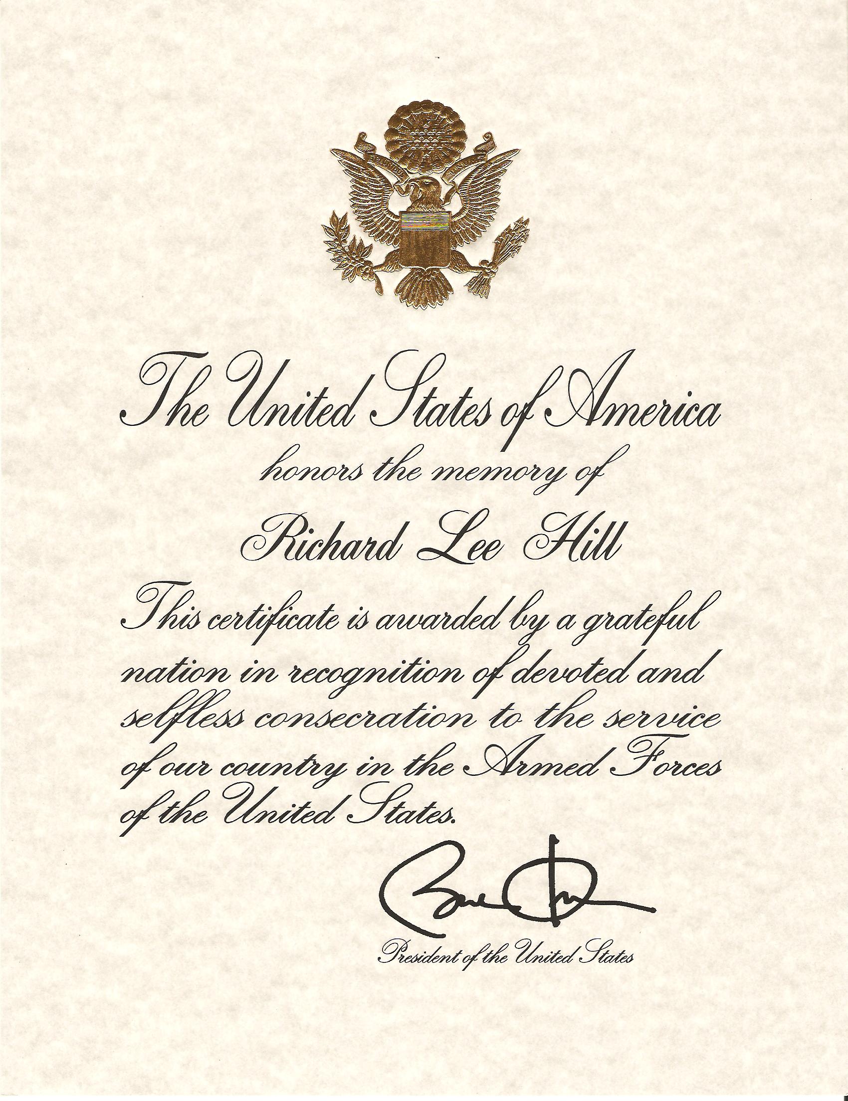 “The President has requested…” Posted on 2013/02/08 by treetrunkrick Tagged current-events, family, government, happiness, history, military Leave a comment The President has requested that the enclosed Presidential Memorial Certificate be sent to you in memory of your beloved, deceased Veteran: Share this: Click to share on Facebook (Opens in new window) Facebook Click to share on X (Opens in new window) X Like Loading... Related