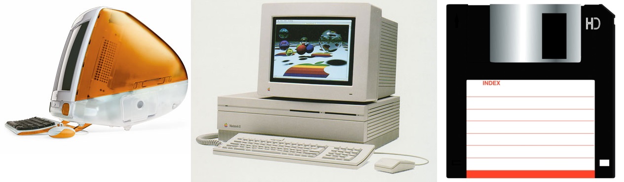 Therefore, I dug through the piles of defunct/archaic electronic equipment and pulled out the following — a tangerine iMac with keyboard and mouse, a Macintosh II with a 14″ Macintosh monitor, keyboard and mouse, and boxes upon bags of floppy disks.