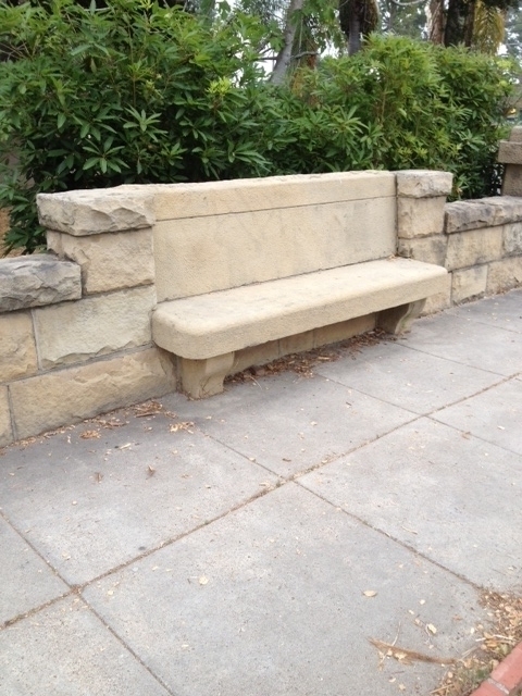 It doesn’t happen often that something pleasantly new appears in my life, which has actually been there all the time. The stone bench shown below is here in Santa Barbara, facing a busy intersection at the corner of Mission and Garden Streets, not far from where I live. I don’t know how old it is, or anything of its history. (Santa Barbara is full of interesting old stone-work, including a surprising number of curb-side hitching-posts, many with their metal rings still attached, though they’ve been unused by horses, or by anyone else, for many years.)