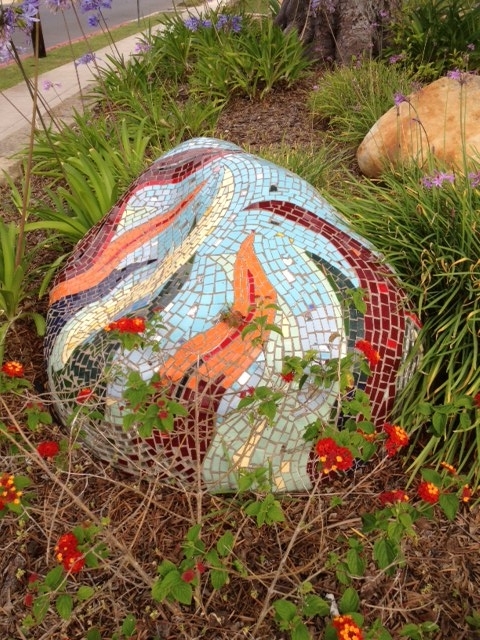 And on the diagonally opposite corner to the dog is this boulder decorated by our eminent Santa Barbara mosaicist, Dan Chrynko, whose colorful and highly imaginative works can be seen all over town: