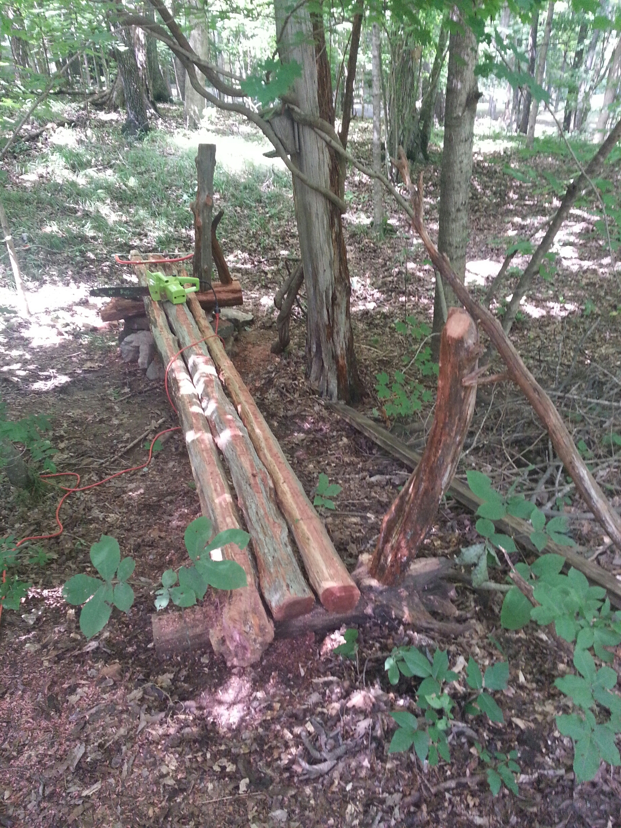 A dry day, hot and humid, 93 deg F, but cooler under the shady canopy of the woods…a good day to make rustic cedar handrails for the bridge!